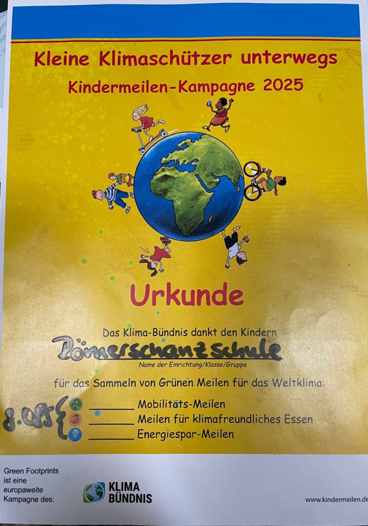 Im Rahmen der Aktion „Kindermeilen – Kleine Klimaschützer unterwegs“ hatten die Kinder unserer Schule in den vergangenen Wochen fleißig Punkte gesammelt – für jeden umweltfreundlich zurückgelegten Weg zu Fuß, mit dem Roller oder dem Fahrrad. So kam eine beeindruckende Zahl an Klimameilen zusammen, die nun stellvertretend für das Engagement der gesamten Schulgemeinschaft übergeben wurde.