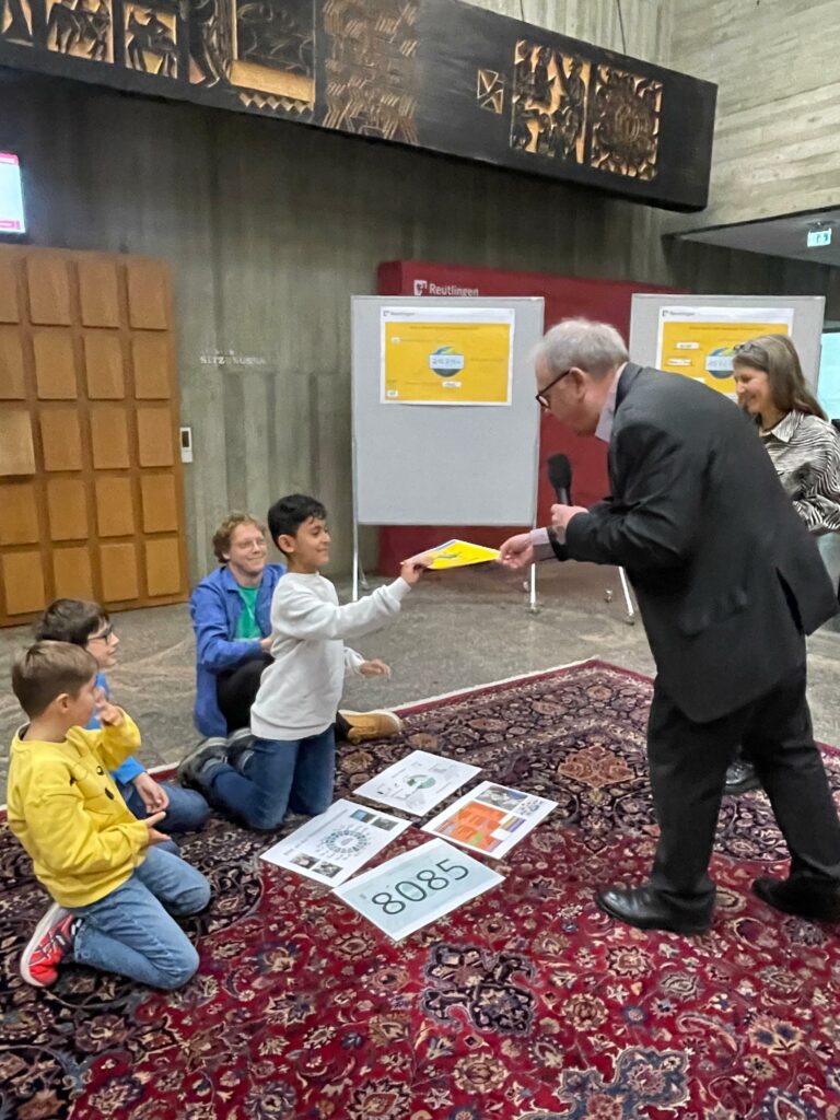Ein besonderer Tag für die Römerschanz-Grundschule Reutlingen: Schülerinnen und Schüler der Klassen 3 und 4 machten sich gemeinsam mit Herrn Frenzl-Scheffner und Frau Ountzidis auf den Weg ins Rathaus, um dort ihre gesammelten Klimameilen im Rahmen eines Festaktes an Oberbürgermeister Thomas Keck zu überreichen.