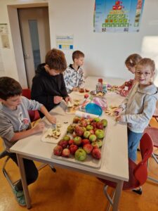 Eine großzügige Apfelspende führte zu Überlegungen, was wir mit diesen Äpfeln machen könnten. Die Kinder der Klasse 2a entschieden sich dazu, dass es Apfelmus und Apfelsaft geben sollte. So machten